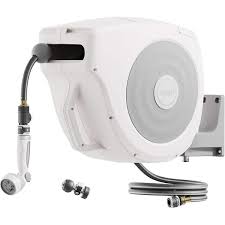 This retractable garden hose reel features a manual retraction design with a free-locking mechanism that secures the hose at any desired length. You can easily